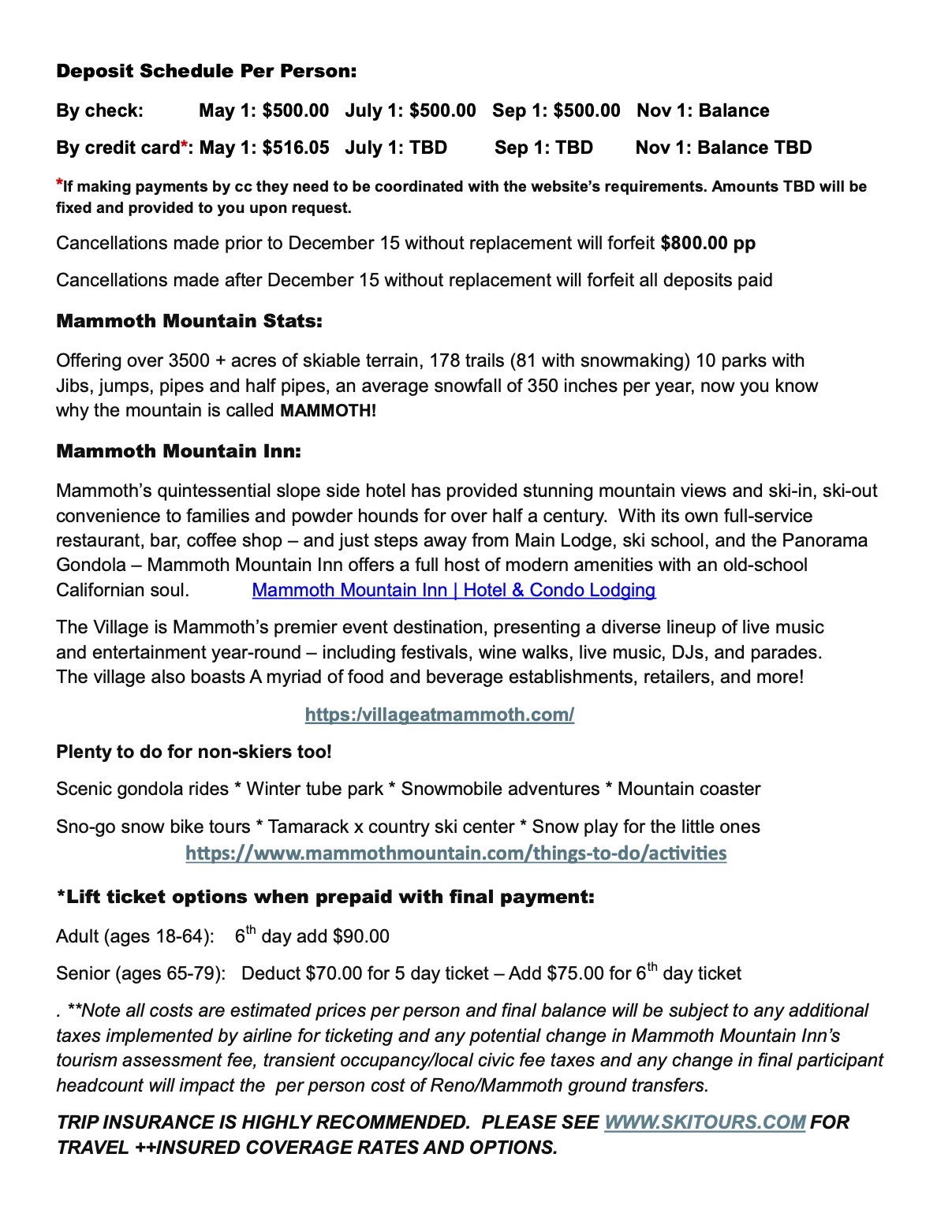 * before December 15 without replacement will forfeit $800 pp